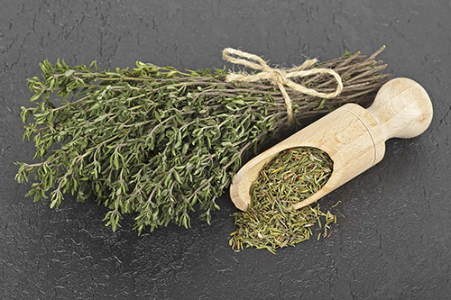 The thyme plant contains 1%-2% of essence rich in two isomers, thymol and carvacrol, and other monoterpenes such as p-cymene, borneol, and geraniol. Thyme owes most of its properties to this essence. It also contains flavonoids and phenolic acids, which help enhance the properties of this essence.